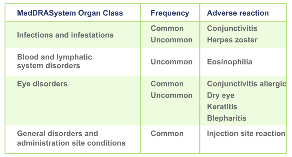 At 16-week the most common adverse reactions are conjunctivitis (6.5%), injection site reactions (0.6%), conjunctivitis allergic (1.8%) and dry eye (1.4%).6