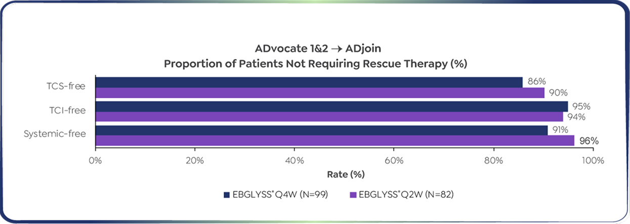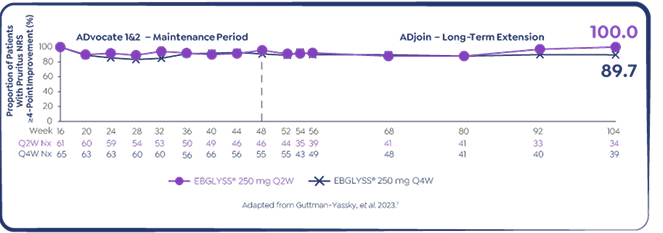 *Responders in ADvocate 1&2 were defined as those patients who achieved either EASI-75 or IGA 0/1 following 16 weeks of EBGLYSS® 250 mg Q2W treatment without use of rescue therapy. From a long-term extension study (ADjoin) in responders enrolled from the parent studies ADvocate 1&2 (EBGLYSS® monotherapy) and ADhere (EBGLYSS® + TCS). Only ADvocate 1&2 results are shown. EBGLYSS® Q2W was also studied to Week 104 but is not a recommended dose once clinical response has been achieved.7