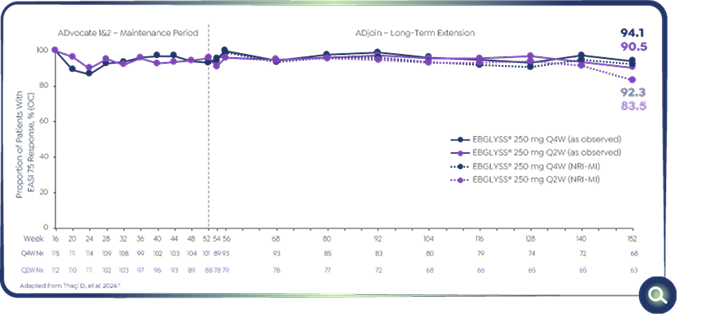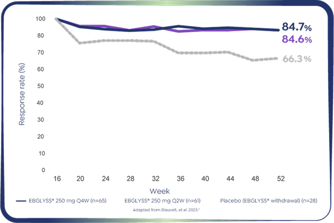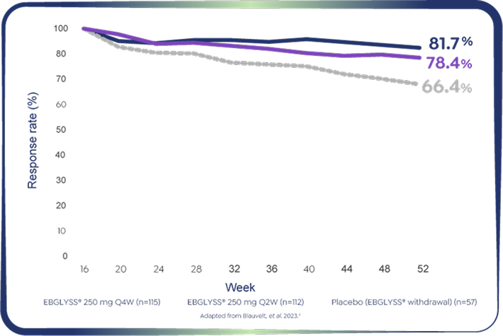 *EBGLYSS® Week 16 EASI-75 responders who maintained EASI-75 at Week 52 with EBGLYSS® Q2W (n=112) 78.4%; EBGLYSS® Q4W (n=115) 81.7%; placebo (EBGLYSS® withdrawal, n=57), 66.4%.4