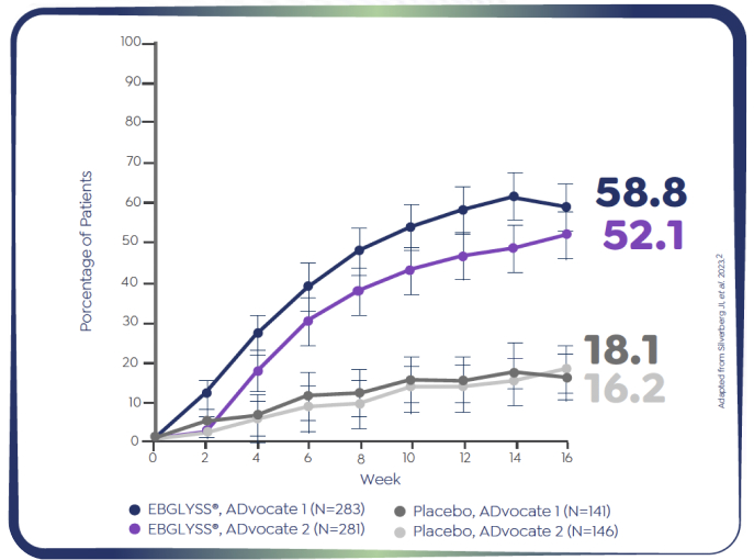 *Patients who achieved EASI-75 at Week 16: ADvocate 1 (N=424): EBGLYSS® (n=283) 58.8%, placebo (n=141) 16.2%; p<0.001; ADvocate 2 (N=427): EBGLYSS® (n=281) 52.1%, placebo (n=146) 18.1%; p<0.001.1,2