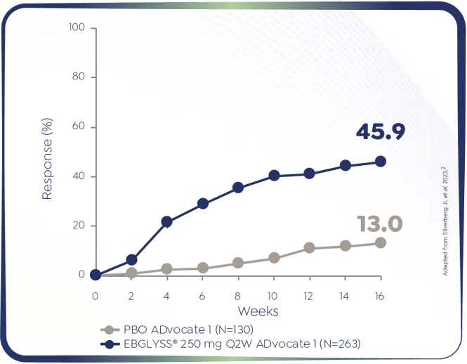 *Patients who had Pruritus NRS ≥4 at baseline and achieved an improvement of ≥4 points on the 11-point Pruritus NRS at Week 16: ADvocate 1 (N=424): EBGLYSS® (n=283) 45.9%, placebo (n=141) 13.0%; p<0.001. ADvocate 2 (N=427): EBGLYSS® (n=281) 39.8%, placebo (n=146) 11.5%; p<0.001.1,2